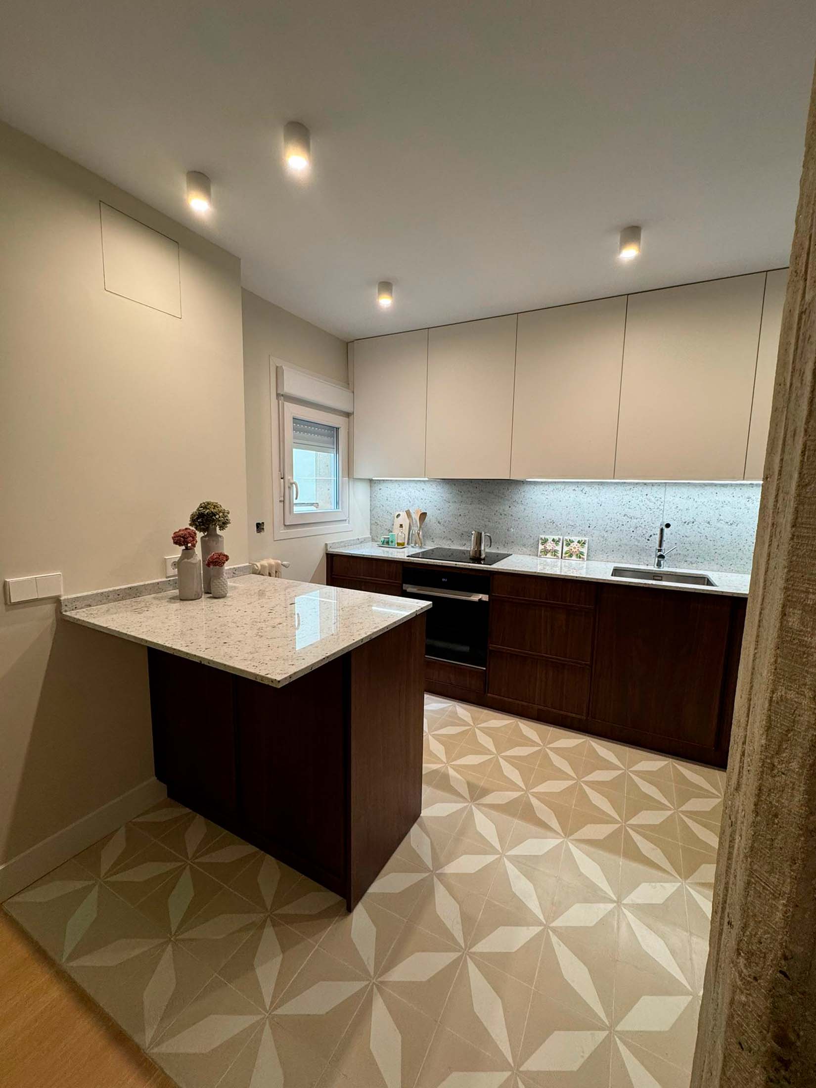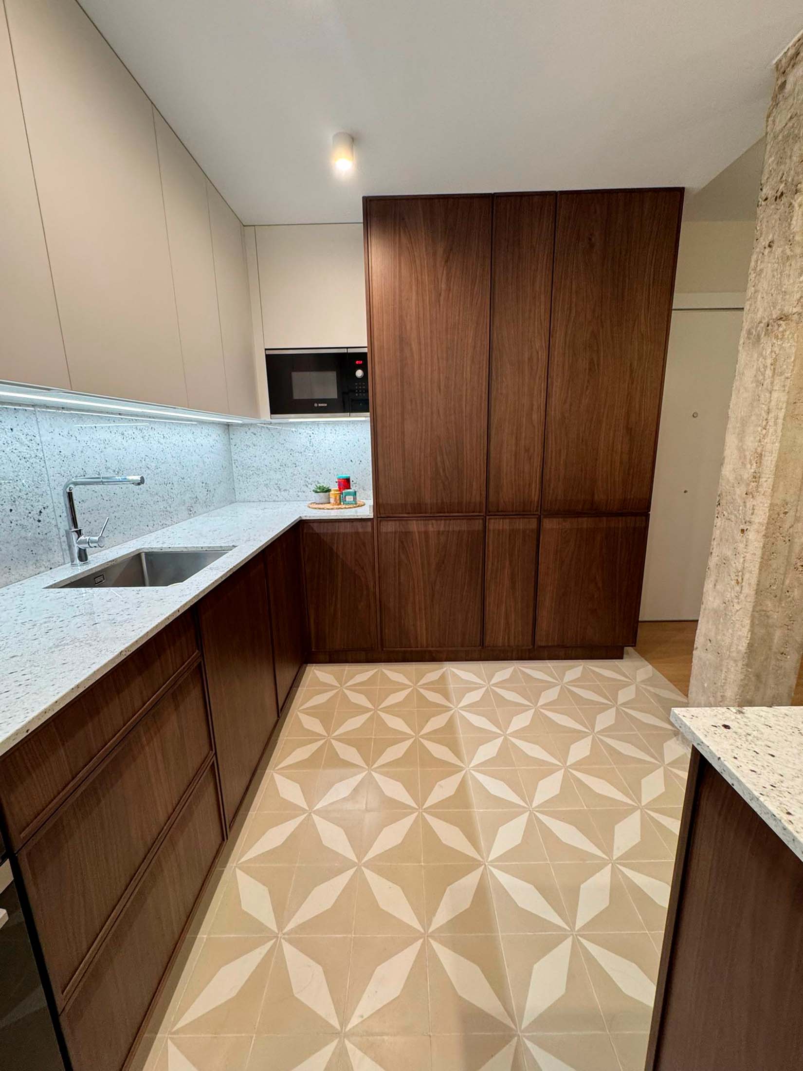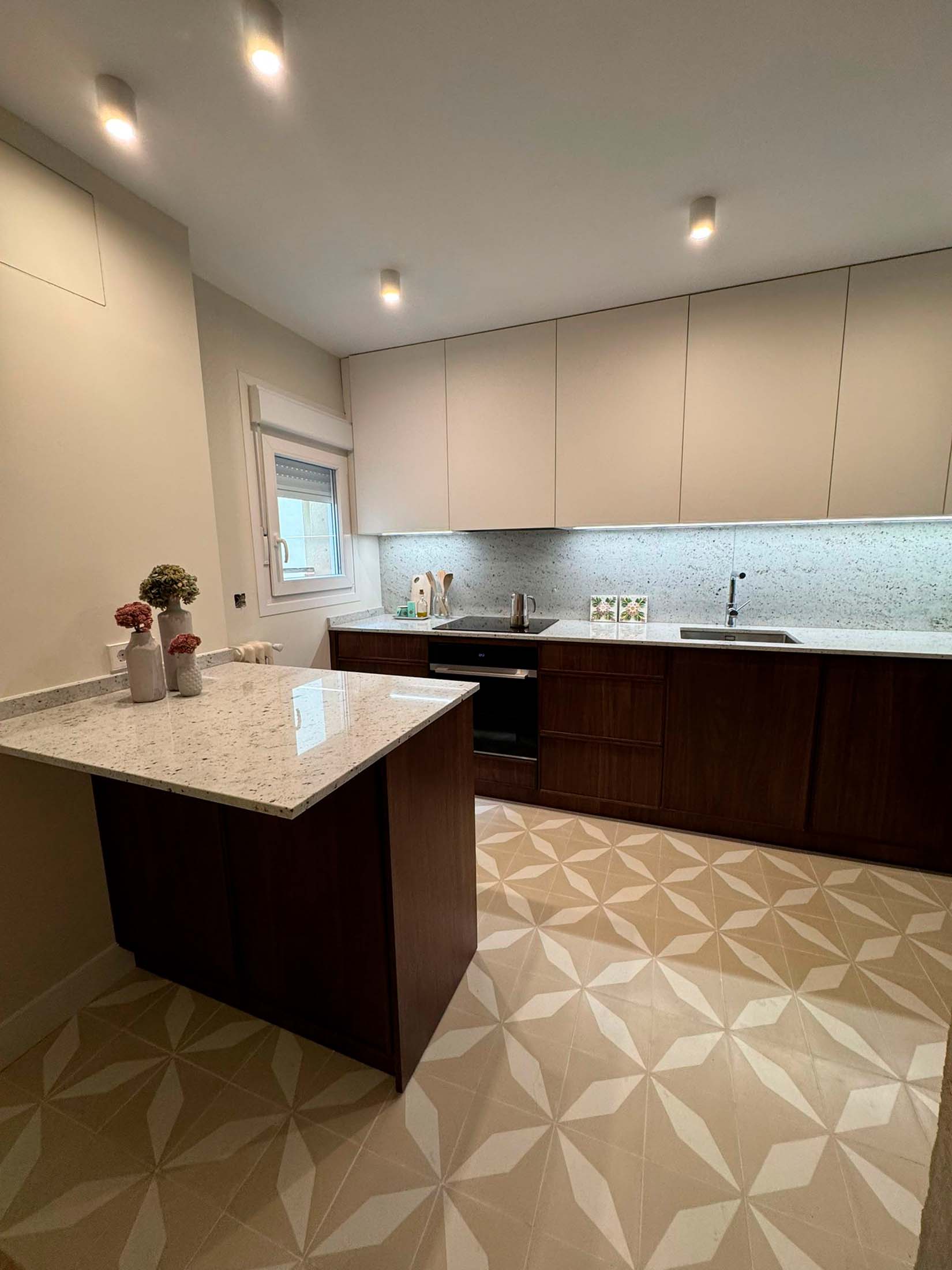 RT Estudio de Cocinas – Interiorismo ha diseñado una cocina que fusiona la calidez de la madera de nogal con la suavidad del laminado en color cashmere, culminando en una encimera de granito natural que aporta solidez y elegancia al conjunto.