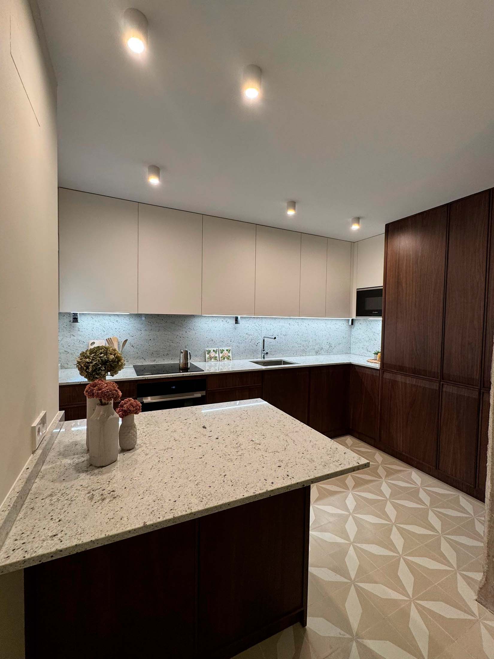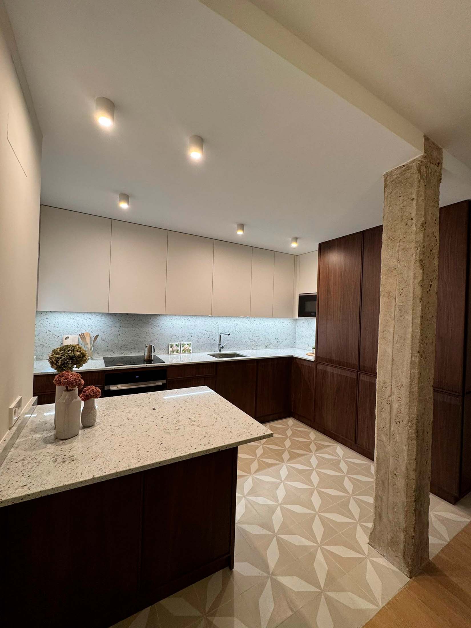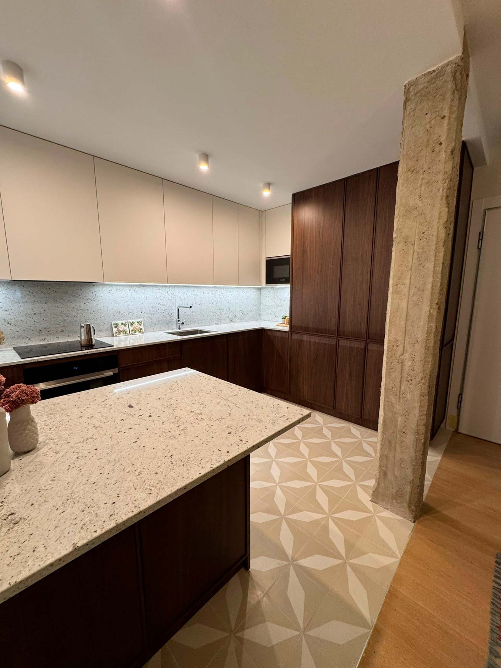 RT Estudio de Cocinas – Interiorismo ha diseñado una cocina que fusiona la calidez de la madera de nogal con la suavidad del laminado en color cashmere, culminando en una encimera de granito natural que aporta solidez y elegancia al conjunto.